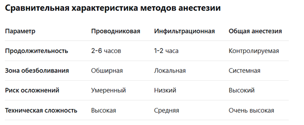 Параметр Проводниковая Инфильтрационная Общая анестезия